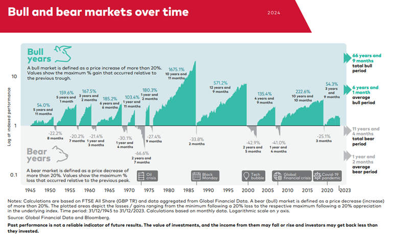 Navigating markets, bull or bear, requires a flexible approach to investment strategies, adapting to market conditions. Understanding the market and how it moves enables portfolio optimisation. This chart about bull and bear runs shows that over a 79-year period to 2023, there were 66.9 bull years (the average bull period was six years and one month), and 11.4 bear years in total (the average bear period was one year and two months). Historically, bull markets have beaten bears and driven long-term gains, proving the practice that investing for the long term and having a disciplined, well-constructed plan can help you reach your goals.